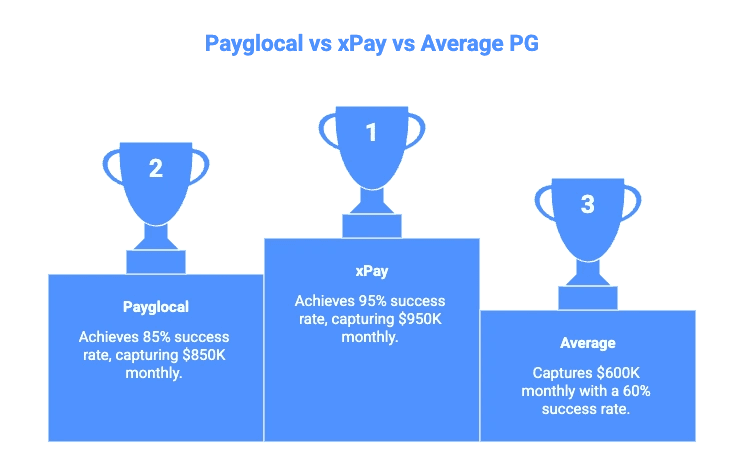 International approval rates directly impact realized revenue for exporters and SaaS companies. In comparative usage patterns, PayGlocal’s average international success rate is ~85%, whereas xPay’s routing logic, local acquiring partnerships, and broader method coverage support ~95% success rates. Even a 5–10% improvement in approval can translate into significant incremental revenue without increasing traffic or CAC.